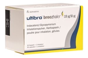 Показания к применению— длительная поддерживающая терапия нарушений бронхиальной проходимости у пациентов с хронической обструктивной болезнью легких, облегчающая симптомы и снижающая количество обострений.Применение при беременности и кормлении грудьюДанных о применении препарата Ультибро Бризхалер у беременных не имеется. Данные о применении у беременных гликопиррония бромида или индакатерола также отсутствуют. В исследовании раннего и позднего эмбриогенеза у крыс никаких эффектов препарата Ультибро Бризхалер, применяемого в разных дозах, на эмбрион или плод не выявлено. У крыс и кроликов, получавших ингаляции гликопиррония бромида, тератогенного действия не выявлено. Отмечалась низкая концентрация гликопиррония бромида в плазме пуповинной крови через 86 мин после однократной в/м инъекции гликопиррония бромида в дозе 0.006 мг/кг женщинами, которым было проведено кесарево сечение. Индакатерол не оказывал тератогенного действия у крыс и кроликов при п/к введении. Однако индакатерол оказывал токсическое действие на репродуктивную систему, что проявлялось в увеличении частоты изменений скелета у кроликов. В связи с отсутствием клинических данных по применению препарата Ультибро Бризхалер у беременных женщин, препарат можно применять во время беременности только если предполагаемая польза применения для матери превышает потенциальный риск для плода. Индакатерол может замедлять процесс родов вследствие релаксирующего действия на гладкую мускулатуру матки. Неизвестно, выделяются ли гликопиррония бромид и/или индакатерол с грудным молоком у женщин. Однако и индакатерол, и гликопиррония бромид (включая его метаболиты) были обнаружены в молоке лактирующих крыс. Учитывая это обстоятельство, применение препарата Ультибро Бризхалер у кормящих грудью женщин допускается, только если предполагаемая польза для матери превышает возможный риск для ребенка. Ни исследования репродуктивной токсичности, ни другие исследования на животных не дают оснований полагать, что препарат может влиять на фертильность у мужчин или женщин.Состав1 капс. гликопиррония основание 50 мкг, что соответствует гликопиррония бромиду 63 мкг индакатерола основание 110 мкг, что соответствует индакатерола малеату 143 мкг. Вспомогательные вещества: лактозы моногидрат — 24.