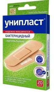Лейкопластырь представляет собой липкую основу — Лейкопластырь «Унипласт фиксирующий» или Лейкопластырь Верофарм с прикрепленной к ней прокладкой изнетканого материала, пропитанного раствором хлоргексидина биглюконата, покрытую с липкой стороны защитным покрытием.Унипласт® бактерицидный натуральный — при порезах, ссадинах, мозолях и небольших ожогах.Характеристики: основа — 100-процентная х/б ткань, воздухопроницаемый, атравматичный, гипоаллергенный, телесная основа.Воздухопроницаемый пластырь имеет натуральную хлопчатобумажную основу телесного цвета, поэтому его удобно использовать для открытых частей тела.Может применяться при мелких повреждениях кожи: ссадинах, порезах, мозолях, ожогах.Описание принципа действия:Лейкопластырь «Унипласт бактерицидный» — наружное антисептическое перевязочное средство.Прикрепленная к липкой основе и пропитанная раствором хлоргексидина биглюконата прокладка, накладывается на рану и оказывает антисептическое действие.Состав:В качестве липкой основы используется Лейкопластырь «Унипласт фиксирующий» или Лейкопластырь Верофарм, в качестве прокладки, прикрепленной к липкой основе, используется полотно двухслойное холстопрошивное медицинского назначения или полотно двухслойное атравматичное, или полотно нетканое термоскрепленное, или полотно нетканое, или медицинский нетканый материал, или нетканый материал, в качестве антисептического раствора используется раствор хлоргексидина биглюконата, в качестве защитного покрытия используется материал антиадгезионный или бумага силиконизированная, или пленка целлюлозная нелакированная, или пленка полиэтилентерефталатная.Область применения:Десмургия.Условия применения:В стационарных и амбулаторных лечебно-профилактических медицинских учреждениях и в домашних условиях. , , , Лейкопластырь «Унипласт бактерицидный» предназначен для использования в качестве наружного антисептического перевязочного средства при мелких повреждениях кожи. , , , , Повышенная чувствительность к веществам, входящим в состав изделия. , Открыть бумажный пакет, вынуть пластырь и снять с его поверхности защитное покрытие, не прикасаясь пальцами к прокладке, приложить ее на рану, а липкую часть пластыря приклеить к сухой чистой коже.Менять каждые 3-4 часа для достижения заживляющего эффекта. , , Возможны аллергические реакции на вещества, входящие в состав изделия. При их возникновении использование пластыря необходимо прекратить. , Лейкопластырь «Унипласт фиксирующий», подушечка из нетканого материала с антисептической пропиткой: хлоргексидина биглюконат , , , Не использовать одновременно с другими наружными средствами на одних и тех же участках ,