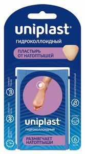 Пластырь «Uniplast®» гидроколлоидный от от натоптышей 42х45 мм 6 шт.Пластырь «Uniplast®» гидроколлоидный от натоптышей за счёт увлажнения и смягчения кожи способствует мягкому удалению натоптыша, мгновенно уменьшает боль от натоптышей, защищает натоптыши от трения и внешнего давления, обеспечивает быстрое заживление кожи, создавая оптимальные условия, предотвращает образование натоптышей.Действие пластыря «Uniplast®» гидроколлоидный: при контакте гидроколлоидного состава с натоптышем под водонепроницаемой плёнкой образуется гель, создающий постоянную влажную среду, способствующую заживлению натоптыша.