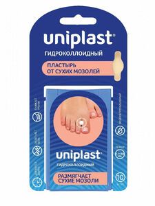 Пластырь «Uniplast» гидроколлоидный от сухих мозолей 17х48 мм 10 шт.Пластырь «Uniplast» гидроколлоидный от сухих мозолей посредством поддержания естественного уровня увлажнённости, предотвращает пересыхание кожи, размягчает сухие мозоли и способствует их более легкому удалению, мгновенно уменьшает боль от мозолей, защищает мозоль от трения и внешнего давления, обеспечивает быстрое заживление кожи, создавая оптимальные условия, предотвращает образование мозолей, способствует правильному воздухообмену в ране, что предохраняет от образования рубцов и шрамов.Действие пластыря «Uniplast» гидроколлоидный: при контакте гидроколлоидного состава с мозолью под водонепроницаемой плёнкой образуется гель, создающий постоянную влажную среду, способствующую заживлению мозоли.
