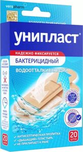 Унипласт® бактерицидный водоотталкивающий (влагостойкий) — защищает от попадания влаги на поврежденную кожу.Характеристики: основа — влагостойкая микроперфорированная пленка, воздухопроницаемый, атравматичный, гипоаллергенный, телесная основа.Основа пластыря выполнена из влагостойкой пленки с микроотверстиями в виде воронок, которая обеспечивает свободный доступ воздуха к коже и в то же время защищает ее от попадания влаги.Описание принципа действия:Лейкопластырь «Унипласт бактерицидный» — наружное антисептическое перевязочное средство.Прикрепленная к липкой основе и пропитанная раствором хлоргексидина биглюконата прокладка, накладывается на рану и оказывает антисептическое действие.
