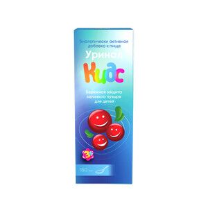 Биологически активная добавка к пище Уринал Кидс.Активный компонентСодержание в суточной норме потребленияБиологически активная добавка к пище Уринал Кидс (далее — Уринал Кидс) содержит натуральный активный компонент, безопасный для применения у детей и является продуманным по наполнению продуктом европейского качества. Уринал Кидс обеспечивает защиту почек, мочевого пузыря и мочевыводящих путей от вредоносных бактерий и негативных факторов окружающей среды, которые особенно уязвимо влияют на детские органы мочевыделительной системы.Уринал Кидс может служить дополнительным источником проантоцианидинов, может оказывать защитное действие на мочевой пузырь и мочевыводящие пути, улучшать функциональное состояние и поддерживать местный иммунитет почек и мочевыводящих путей у детей.Уринал Кидс подходит как для комбинированного (например, совместно с антибиотиками), так и для самостоятельного применения.Эффективность не снижается при длительном приеме, так как у бактерий не формируется устойчивость (резистентность) к действию растительных компонентов.Уринал Кидс имеет высокий профиль безопасности, в связи с чем разрешен к применению у детей.Форма сиропа является одной из предпочтительных для применения в детском возрасте в связи с быстротой всасывания, сироп имеет приятный натуральный вкус.Уринал Кидс не содержит ароматизаторов, красителей, консервантов.Характеристика компонентов Уринал Кидс Сок клюквы (Vaccinium macrocarpon) — уникальный по пищевой ценности продукт.Сок клюквы стандартизован по содержащимся в нем особым полезным веществам -проантоцианидинам, которые и обеспечивают комплексную защиту почек и мочевыводящих путей от бактерий, негативных факторов окружающей среды, поддерживают местный иммунитет. Проантоцианидины клюквы образуют защитный слой на слизистых оболочках мочевыводящих путей, препятствуя прикреплению к их поверхностям вредоносных бактерий. В результате этого данные бактерии не могут размножаться, теряют способность к жизнедеятельности и колонизации мочевого пузыря и мочевыводящих путей.Помимо этого, известно мочегонное, иммуностимулирующее действие клюквы.Данные особенности клюквы, подтвержденные результатами многочисленных исследований, дают возможность применять ее для защиты мочевыводящих путей как в дополнении к антибиотикам, так и самостоятельно.(20 мл, 4 мерные ложки сиропа) Проантоцианидины — 20 мг % от адекватного уровня потребления — 20