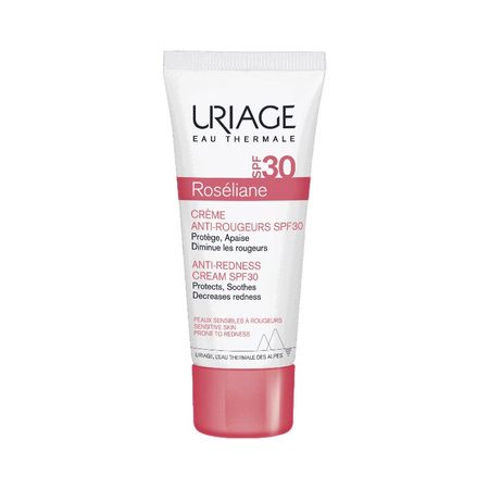 Компания Uriage (Урьяж) — это производитель натуральной косметики основой которой является термальная вода. Вся продукция компании производится согласно высочайшим международным стандартам и особому контролю за качеством сырья и микробиологическому контролю. Базовая составляющая любой гаммы данного бренда составляем термальная вода, источник которой находится у подножия Альп на высоте 400 метров, Гамма РОЗЕЛЬЯН Средства гаммы предназначены для любого типа чувствительной кожи с покраснением (периодически возникающим или стойким), ощущением жара, видимыми мелкими сосудами в области крыльев носа, щек и/или скул. Uriage Розельян Крем против покраснений SPF 30, Внешний вид: Кремовая текстура белого цвета с перламутровыми зелеными частицами и приятным ароматом Специальные особенности: Гипоаллергенно, некомедогенно Благодаря действию активных ингредиентов и УФ фильтров, крем уменьшает ощущение жара, успокаивает, увлажняет, укрепляет кожный барьер. Повышает устойчивость кожи к перепадам температуры. Зеленые перламутровые частицы оптически скрывают зоны покраснения. Средство с лёгкой текстурой и приятным ароматом предназначено для чувствительной кожи любого типа. Результат: Уменьшение ощущения жара, оптическое скрытие покраснений, повышение устойчивости кожи к перепадам температур, защита от УФ излучения
