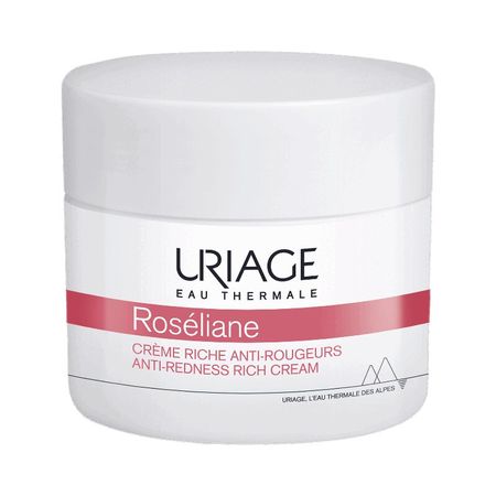 Компания Uriage (Урьяж) — это производитель натуральной косметики основой которой является термальная вода. Вся продукция компании производится согласно высочайшим международным стандартам и особому контролю за качеством сырья и микробиологическому контролю. Базовая составляющая любой гаммы данного бренда составляем термальная вода, источник которой находится у подножия Альп на высоте 400 метров, Гамма РОЗЕЛЬЯН Средства гаммы предназначены для любого типа чувствительной кожи с покраснением (периодически возникающим или стойким), ощущением жара, видимыми мелкими сосудами в области крыльев носа, щек и/или скул. Uriage Розельян Насыщенный крем против покраснений Внешний вид: насыщенная кремообразная текстура с зелеными перламутровыми частицами Специальные особенности: Гипоаллергенно, не комедогенно Описание и свойства: Благодаря действию активных ингредиентов крем уменьшает ощущение жара, успокаивает, увлажняет, питает. Укрепляет кожный барьер, тем самым повышает устойчивость кожи к перепадам температуры. Зеленые перламутро­вые частицы оптически скрывают зоны покраснения. Средство с насыщенной, но тающей текстурой и приятным ароматом быстро впитывается, служит хорошей базой для макияжа. Предназначен для сухой и очень сухой чувствительной кожи. Результат: Оптически скрывает зоны покраснения, увлажняет, питает, уменьшает ощущение жара