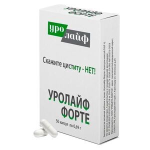 УРОЛАЙФ-ФОРТЕ — Биологически активная добавка (БАД) к пище — можно применять в составе комбинированной терапии интерстициального цистита, лучевого цистита и синдрома гиперактивного мочевого пузыря.Содержание в суточной дозировке (1 капсула), мг % от норм потребленияГлюкозамин 190,0 27*Хондроитинсульфат 180,0 30**Магния аспартат 11,0 3*Витамин В6 1,0 50*** Адекватный уровень суточного потребления, согласно Единым санитарно-эпидемиологическим и гигиеническим требованиям к товарам, подлежащим санитарно-эпидемиологическому надзору (контролю)** Рекомендуемый уровень суточного потребления, согласно Техническому регламенту Таможенного союза «Пищевая продукция в части её маркировки» ТР ТС 022/2011Как известно, одной из причин возникновения различных видов хронического цистита (интерстициального, лучевого, бактериального), является разрушение защитного гликозаминогликанового слоя эпителия мочевого пузыря.Этот слой состоит из хондроитинсульфата, гиалуроновой кислоты и других мукополисахаридов.Его предназначение — защита уротелия от прикрепления бактерий и воздействия токсичных компонентов мочи.Восстановление этого слоя является ключевым моментом патогенетической терапии следующих видов хронического цистита: Интерстициального цистита Лучевого цистита Хронического бактериального циститаВ состав БАД «Уролай-Форте» входят гликозами-ногликановые компоненты и их предшественники. В тонком кишечнике происходит всасывание хондроитинсульфата и глюкозамина, затем они экскретируются почками и с мочой попадают в мочевой пузырь. Регулярный прием хондроитинсульфата помогает восстановить защитныйгликозаминогликановый слой слизистой оболочки мочевого пузыря (уротелия).В состав капсул УРОЛАЙФ ФОРТЕ входит: Повышенная (по сравнению с капсулами УРОЛАЙФ) доза хондроитинсульфата. Хондроитинсульфат предназначен для так называемой пероральной гликозаминогликанзаместительной терапии, т.е. восстановления защитного слоя мочевого пузыря. Кроме того, хондроитинсульфат снижает чувствительность болевых рецепторов в мочевом пузыре. МагнийСнижает хроническую боль при интерстициальном цистите. Витамин В6Снижает хроническую боль при интерстициальном цистите. Глюкозамина гидрохлоридНеобходим для синтеза гиалуроновой кислоты в зонтичных клетках мочевого пузыря, а также обладает противовоспалительным действием.