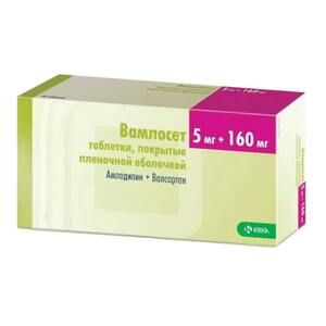 Показания к применению— артериальная гипертензия у пациентов, которым показана комбинированная терапия.Противопоказания— тяжелая печеночная недостаточность (более 9 балов по шкале Чайлд-Пью) — билиарный цирроз и холестаз — тяжелая почечная недостаточность (КК менее 30 мл/мин) — применение у пациентов, находящихся на гемодиализе — выраженная артериальная гипотензия (систолическое АД менее 90 мм рт.ст.) — коллапс, шок (включая кардиогенный шок) — обструкция выносящего тракта левого желудочка (в т.ч. гипертрофическая обструктивная кардиомиопатия (ГОКМП) и аортальный стеноз тяжелой степени) — гемодинамически нестабильная сердечная недостаточность после острого инфаркта миокарда — одновременное применение с алискиреном у пациентов с сахарным диабетом или нарушением функции почек (КК менее 60 мл/мин) — первичный гиперальдостеронизм — беременность — период лактации (грудного вскармливания) — повышенная чувствительность к амлодипину, другим производным дигидропиридинового ряда, валсартану или к другим компонентам препарата. Безопасность применения препарата Вамлосет у пациентов после перенесенной трансплантации почки, а также детей и подростков в возрасте до 18 лет не установлена. С осторожностью следует назначать препарат при нарушениях функции печени легкой (5-6 баллов по шкале Чайлд-Пью) и умеренной (7-9 баллов по шкале Чайлд-Пью) степени тяжестиобструктивных заболеваниях желчных путейнарушениях функции почек легкой и средней степени тяжести (КК 30-50 мл/мин)одностороннем или двустороннем стенозе почечных артерий или стенозе артерии единственной почкихронической сердечной недостаточности III-IV функционального класса по классификации NYHAгиперкалиемиигипонатриемиисоблюдении диеты с ограничением потребления поваренной солисниженном ОЦК (в т.ч. при диарее, рвоте)у пациентов с наследственным ангионевротическим отеком, либо отеком на фоне предшествующей терапии антагонистами рецепторов ангиотензина IIу пациентов с митральным и аортальным стенозом легкой и умеренной степени.Состав1 таб. амлодипина бесилат 6.94 мг, что соответствует содержанию амлодипина 5 мг валсартан А субстанция-гранулы 251.35 мг, что соответствует содержанию валсартана 160 мг. Вспомогательные вещества: маннитол — 50.