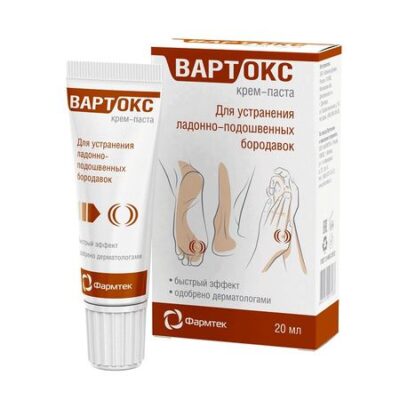 • ВАРТОКС устранит ладонно-подошвенные бородавки и поможет восстановить внешний вид кожи • ВАРТОКС не содержит агрессивных компонентов и не повреждает здоровые ткани. • ВАРТОКС воздействует на причину образования бородавок • ВАРТОКС крем-паста одобрена дерматологами Причины и признаки появления подошвенных бородавок Подошвенные бородавки являются доброкачественными разрастаниями на коже подошв, вследствие поражения вирусом папилломы человека. Бородавка может выступать на 1-3 мм или находиться на одном уровне с кожей. Серьезной угрозы здоровью бородавки не представляют, но нередко вызывают болезненные ощущения при ходьбе и придают коже неприглядный внешний вид. Активные компоненты ВАРТОКС: карбамид (мочевина) 40%, глицирризиновая кислота. Форма выпуска: крем-паста в ламинатной тубе объемом 20 мл Механизм действия • Крем-паста содержит карбамид (мочевину) в концентрации 40% , который позволяет безболезненно размягчить ткань бородавки и затем легко удалить ее маникюрными принадлежностями. • Глицирризиновая кислота обладает противовирусным эффектом, в том числе и против вируса папилломы человека. Меры предосторожности: избегайте контакта с глазами и слизистыми оболочками, возможна индивидуальная непереносимость отдельных компонентов Условия хранения: хранить при температуре от +5ºС до +25ºС Срок годности: 3 года