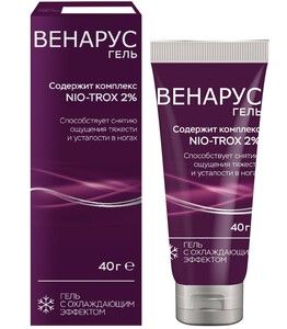Благодаря уникальному комплексу активных компонентов, Венарус гель обладает следующими эффектами: — снимает чувство тяжести и усталости в ногах, — восстанавливает ощущение легкости и комфорта в ногах, — смягчает и защищает кожу ног. В состав средства входят:Активный комплекс NIO-TROX 2% (Троксерутин ниосомальный) — это инновационная трансдермальная система доставки троксерутина в форме ниосомальных везикул, способных проникать глубоко в кожу. В сочетании с другими активными компонентами (экстракт конского каштана, экстракт косточек красного винограда и др.), оказывает положительное действие на состояние и внешний вид ног.Комплекс NIO-TROX 2% способствует: — улучшению микроциркуляции, — уменьшению проницаемости капилляров, — уменьшению отечности в ногах, — уменьшению ощущения тяжести в ногах.Экстракт конского каштана (эсцин) — венотонизирующее средство растительного происхождения. Уменьшает проницаемость сосудистой стенки и ломкость капилляров. Обладает противовоспалительным и противоотечным свойствами. Улучшает микроциркуляцию и состояние кожи.Экстракт красного винограда — оказывает антиоксидантное и противоотечное действие, тем самым уменьшает нагрузку, способствующую развитию варикозного расширения вен.Масло виноградных косточек в сочетании с декспантенолом — оказывают противовоспалительное, успокаивающее, регенерирующее действие на кожу.