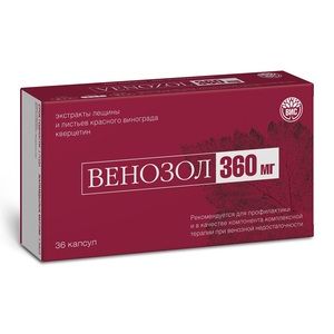 Рекомендуется для профилактики и в качестве компонента комплексной терапии при венозной недостаточности. Дополнительный источник кверцетина.При хронической венозной недостаточности (ХВН) возникают нарушения в работе венозной системы – в стенке вены наблюдается воспаление, теряется тонус и эластичность, вены расширены, кровь застаивается в нижних конечностях. Такое состояние (варикоз, варикозное расширение вен, варикозная болезнь) сопровождается неприятными симптомами, которые снижают качество жизни человека – человек может жаловаться на то, что отекают ноги, на боль, тяжесть, усталость ног,жжение в венах, чувство напряжения и распирания. ВЕНОЗОЛ 360 мг – это биологическая активная добавка на основе экстракта листьев красного винограда и листьев лещины для поддержки венозного тонуса. Рекомендуется в качестве компонента комплексной терапии при венозной недостаточности. Активные компоненты способствует повышению венозного тонуса, снижению отека (улучшению лимфатического оттока) при симптомах тяжести, усталости и отечности ног. Действие активных компонентов ВЕНОЗОЛ 360 мг направлено на поддержку и облегчение симптомов при недостаточности вен.ВЕНОЗОЛ 360 мг выпускается в капсулах, что делает применение комфортным благодаря небольшому размеру капсулы, удобного для проглатывания. Рекомендуется принимать по 1 капсуле в течение 1 месяца. В 1 капсуле ВЕНОЗОЛ 360 содержится не менее 7,6 мг кверцетина (25% от АУП).Линейка Венозол предназначена для поддержки венозного тонуса и включает в себя биологически активные добавки для внутреннего применения и косметические средства для комплексного воздействия изнутри и снаружи. ВЕНОЗОЛ 360 мг может применяться как самостоятельная биологически активная добавка, так и в сочетании с наружными формами – ВЕНОЗОЛ крем и гель.Описание компонентов:Экстракт листьев красного винограда – источник фармакологически активных флавоноидов (кверцетин, изокверцетин и др.). Обладает способностью оказывать защитное действие на эндотелий сосудов (стабилизируя мембраны и увеличивая эластичность сосудов), нормализовать сосудистую проницаемость, что замедляет образование отеков или уменьшает уже существующие. Способствует снижению воспаления, улучшению лимфооттока и уменьшения отека, снижению тяжести, утомляемости, усталости ног. Входит в Клинические рекомендации по диагностике и лечению хронических заболеваний вен. Экстракт лещины (лесного орешника) является источником биофлаваноидов, обладает капилляроукрепляющими свойствами. Способствует укреплению стенок сосудов, повышению их эластичности, улучшению местного кровообращения.Кверцетин – биофлаваноид, обладающий противовоспалительной, антиоксидантной активностью. Снижает проницаемость сосудистой стенки, способствует улучшению микроциркуляции, купированию отечности, уменьшению тяжести в ногах.