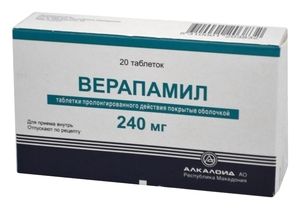 Верапамил — продолговатые, двояковыпуклые таблетки пролонгированного действия, покрытые оболочкой серовато-голубого цвета, с риской на одной стороне. Верапамил является одним из основных препаратов группы блокаторов «медленных» кальциевых каналов. Обладает антиаритмической, антиангинальной и антигипертензивной активностью.