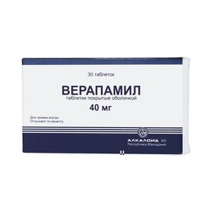 Показания к применению- купирование приступов суправентрикулярной пароксизмальной тахикардии; пароксизмов мерцания и трепетания предсердий, предсердной экстрасистолии.Применение при беременности и кормлении грудьюПротивопоказан во время беременности и в период лактации.Противопоказания- хроническая сердечная недостаточность IIБ-III степени;- артериальная гипотензия;- острый инфаркт миокарда;- синоатриальная блокада;- синдром слабости синусового узла;- стеноз устья аорты;- синдром Морганьи-Адамса-Стокса;- дигиталисная интоксикация;- атриовентрикулярная блокада II и III степени;- желудочковая тахикардия;- кардиогенный шок;- синдром Вольфа-Паркинсона-Уайта или синдром Лауна-Ганонга-Левина в сочетании с трепетанием или фибрилляцией предсердий (кроме больных с кардиостимулятором);- порфирия;- беременность;- период лактации;- парентеральное введение в течение предыдущих 2 часов какого-либо бета-адреноблокатора,- возраст до 18 лет (эффективность и безопасность не установлены);- повышенная чувствительность к компонентам препарата,С осторожностью: атриовентрикулярная блокада I степени, брадикардия, одновременный прием бета-адреноблокаторов, инфаркт миокарда с левожелудочковой недостаточностью, пожилой возраст, хроническая сердечная недостаточность I и IIА степени, выраженные нарушения функции печени и почек.Побочное действиеСо стороны сердечно-сосудистой системы: выраженная брадикардия (не менее 50 уд/мин), выраженное снижение АД, развитие или усугубление сердечной недостаточности, тахикардия; возможно развитие стенокардии, вплоть до инфаркта миокарда (особенно у больных с тяжелым обструктивным поражением коронарных артерий), аритмии (в том числе мерцание и трепетание желудочков); при быстром введении — атриовентрикулярная блокада III степени, асистолия, коллапс.Со стороны ЦНС: головокружение, головная боль, обморок, тревожность, заторможенность, повышенная утомляемость, астения, сонливость, депрессия, экстрапирамидные нарушения.Со стороны пищеварительной системы: тошнота, повышение активности «печеночных» трансаминаз и щелочной фосфатазы.Аллергические реакции: кожный зуд, сыпь, гиперимия кожи лица, мультиморфная экссудативная эритема (в том числе синдром Стивенса-Джонсона).Прочие: транзиторная потеря зрения на фоне максимальной концентрации, отек легких, тромбоцитопения бессимптомная, периферические отеки (отечность лодыжек, стоп и голеней).Состав1 таблетка содержит:Активное вещество: верапамила гидрохлорид 40 мг.