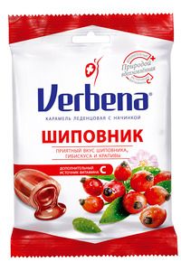 Действие Verbena Шиповник определяется свойствами входящих в её состав витамина С экстрактов шиповника, гибискуса и крапивы. Особая технология производства, при которой начинка варится отдельно, при более низких температурах, чем леденцовая основа, позволяет сохранить большее количество полезных экстрактов трав.Витамин С является одним из основных витаминов в рационе человека, необходимых для нормального функционирования и защиты организма. Он укрепляет иммунитет, усиливает устойчивость к инфекциям и уменьшает эффекты воздействия различных аллергенов на организм.Шиповник является натуральным источником витаминов группы В, вит. С, Е, К, Р, каротина, органических кислот, богат на микроэлементы, обладает противовоспалительными и ранозаживляющими свойствами, благотворно влияет на центральную нервную систему и поддерживает иммунитет организма.Леденцы твёрдые, овальной формы, красного цвета, с жидкой начинкой.