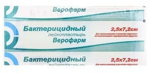 Бактерицидный лейкопластырь Верофарм представляет собой ленту Лейкопластыря Верофарм или Лейкопластыря «Унипласт фиксирующий» с подушечкой зеленого цвета из нетканого материала, пропитанного раствором антисептиков, покрытую с липкой стороны защитным покрытием.Описание принципа действия:Бриллиантовый зеленый, синтомицин и фурацилин, содержащиеся в подушечке лейкопластыря оказывают антисептическое действие при наклеивании пластыря на небольшие порезы, ссадины, царапины и другие мелкие повреждения кожи.