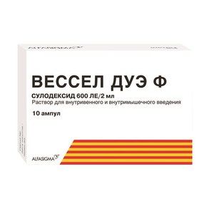 Показания к применению- ангиопатии с повышенным риском тромбообразования, в т.ч. и после перенесенного инфаркта миокарда;- нарушение мозгового кровообращения, включая острый период ишемического инсульта и период раннего восстановления;- дисциркуляторная энцефалопатия, обусловленная атеросклерозом, сахарным диабетом, артериальной гипертензией;- сосудистая деменция;- окклюзионные поражения периферических артерий как атеросклеротического, так и диабетического генеза;- флебопатии, тромбозы глубоких вен;- микроангиопатии (нефропатия, ретинопатия, невропатия);- макроангиопатии при сахарном диабете (синдром диабетической стопы, энцефалопатия, кардиопатия);- тромбофилические состояния, антифосфолипидный синдром (назначают совместно с ацетилсалициловой кислотой, а также вслед за низкомолекулярными гепаринами);- лечение гепарин-индуцированной тромботической тромбоцитопении (поскольку препарат не вызывает и не усугубляет ее).Применение при беременности и кормлении грудьюПротивопоказано применение в I триместре беременности.Имеется положительный опыт применения сулодексида у пациенток с сахарным диабетом типа 1 во II и III триместрах беременности с целью лечения и профилактики сосудистых осложнений, при развитии позднего токсикоза беременных.Применять препарат Вессел Дуэ Ф при беременности во II и III триместрах следует строго под наблюдением врача.Данные о применении препарата в период лактации (грудного вскармливания) не предоставлены.Противопоказания- геморрагические диатезы и заболевания, сопровождающиеся пониженной свертываемостью крови;- I триместр беременности;- гиперчувствительность к компонентам препарата.Побочное действиеСо стороны пищеварительной системы: тошнота, рвота, боли в эпигастрии.Аллергические реакции: кожная сыпь различной локализации.Местные реакции: боль, жжение, гематома в месте инъекции.Состав1 амп.:сулодексид 600 ЛЕ*Вспомогательные вещества: натрия хлорид — 18 мг, вода д/и — до 2 мл.Взаимодействие с другими препаратамиКлинически значимого взаимодействия препарата Вессел Дуэ Ф с другими препаратами не установлено.При применении сулодексида не рекомендуется одновременно использовать антикоагулянты (прямые и непрямые) и антиагреганты.
