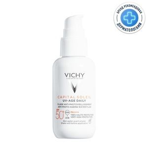 Vichy Capital Soleil UV-Age Daily Невесомый солнцезащитный флюид для лица против признаков фотостарения SPF50+.Более 80% признаков старения кожи вызваны ежедневным воздействием UV-лучей и негативным воздействием окружающей среды. Флюид обеспечивает очень высокую степень UVA и UVB защиты благодаря системе UV-фильтров SPF50+, PA++++ (UVA-PF 46). Инновационная формула*, усиленная вулканической термальной водой VICHY, пробиотической фракцией, пептидом и ниацинамидом в составе, защищает от признаков фотостарения кожи — пигментации, преждевременных морщин и снижения эластичности кожи, вызванных воздействием UV-лучей. Обеспечивает антиоксидантную защиту от последствий негативного воздействия окружающей среды и инфракрасного излучения. Запатентованная технология NETLOCK создает на поверхности кожи невесомую и невидимую защиту.Легкая нелипкая текстура флюида не ощущается на коже и устойчива к поту. Протестировано под дерматологическим и офтальмологическим контролем. Гипоаллергенно. Подходит для чувствительной кожи. Не раздражает слизистую глаз.