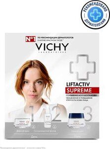 В набор входят три средства:1. Дневной крем Supreme для нормальной и комбинированной кожи 50 млДневной крем мгновенно выравнивает микрорельеф кожи и визуально скрывает морщинки. Придает коже естественное полуматовое сияние и подчеркивает ее природную красоту. Первый антивозрастной уход для нормальной и комбинированной кожи лица с биологическим действием для непрерывной коррекции признаков старения: моментально, в течение всего дня и день за днем.2. Ночной крем Supreme 15 мл Ночной крем против морщин для упругости и увлажнения содержит высокую концентрацию чистой гиалуроновой кислоты, 5% рамнозу натурального происхождения и витамин С. Крем мгновенно придает коже упругость и гладкость. Утром лицо выглядит заметно подтянутым и сияющим.3. Невесомый солнцезащитный флюид против признаков фотостарения UV-Age Daily SPF 50+ 3 мл Средство гарантирует высокую степень фотозащиты, сокращает признаки фотостарения и обеспечивает антиоксидантную защиту кожи. Формула средства защищает от пигментации, преждевременных морщин и снижения эластичности кожи.Активные компонентыДневной крем: кофеин, аденозин, рамноза 5% и неогесперидин.Ночной крем: гиалуроновая кислота 0,5%, рамноза 5%, витамин СФлюид: технология Netlock, химический фильтр нового поколения для защиты от ультра-широкого спектра излучения.