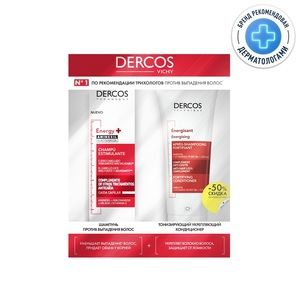 1.Dercos Energy + Шампунь против выпадения волос, 200 млФормула Energy + с активной концентрацией ингредиентов [Аминексил + Ниацинамид + 4% AHA + Витамин Е] укрепляет волосы и борется с выпадением волос. Выпадение волос уменьшено, волосы ощутимо более крепкие, приобретают жизненную силу. +47% волокно волоса более сильное и прочное. +19% объема волос в течение 24 часов.2.Dercos Кондиционер укрепляющий против выпадения волос «Тонизирующий», 200 млТонизирующий укрепляющий кондиционер против выпадения волос Vichy Dercos Aminexil интенсивно питает волосы и воздействует на зоны их ломкости, восстанавливая волокно волоса и обволакивая его в защитную мембрану.