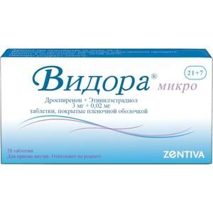 Показания к применению— контрацепция — контрацепция и лечение угревой сыпи средней тяжести (acne vulgaris) — контрацепция и лечение тяжелой формы предменструального синдрома (ПМС).Применение при беременности и кормлении грудьюПрименение препарата Видора . микро противопоказано во время беременности. Если беременность выявляется во время приема препарата Видора . микро, препарат следует сразу же отменить. Однако обширные эпидемиологические исследования не выявили повышенного риска дефектов развития у детей, рожденных женщинами, получавших половые гормоны до беременности, или тератогенного действия в случаях, когда половые гормоны принимались по неосторожности в ранние сроки беременности. В то же время, данные о результатах приема дроспиренона+этинилэстрадиола при беременности ограничены, что не позволяет сделать какие-либо выводы о негативном влиянии препарата на беременность, здоровье плода и новорожденного. В настоящее время какие-либо значимые эпидемиологические данные отсутствуют. Применение препарата Видора . микро противопоказано в период грудного вскармливания. КОК могут уменьшать количество грудного молока изменять его состав, поэтому их применение не рекомендуется до прекращения грудного вскармливания. Небольшое количество половых гормонов и/или их метаболитов может выделяться с грудным молоком.Состав1 таб. этинилэстрадиол 20 мкг дроспиренон 3 мг. Вспомогательные вещества: лактоза безводная — 89.