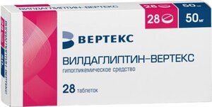 Круглые плоскоцилиндрические таблетки белого или почти белого цвета с фаской. Допускается мраморность.Характеристика препарата:Одна таблетка препарата Вилдаглиптин-ВЕРТЕКС содержит 50 мг действующего вещества вилдаглиптина.Препарат Вилдаглиптин-ВЕРТЕКС используют в качестве терапии в случае неэффективности диетотерапии и физических упражнений у пациентов с сахарным диабетом 2 типа. Он помогает контролировать уровень глюкозы в крови. Препарат Вилдаглиптин-ВЕРТЕКС является пероральным гипогликемическим препаратом.В зависимости от Вашего состояния, лечащий врач может назначить препарат Вилдаглиптин-ВЕРТЕКС в качестве монотерапии или в комбинации с другими гипогликемическими препаратами.