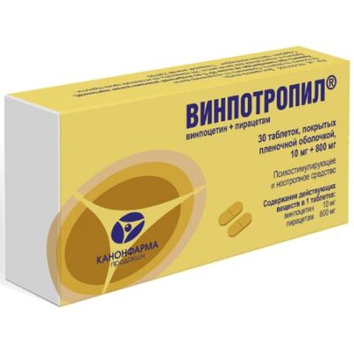 Показания Винпоцетин После приема внутрь винпоцетин хорошо абсорбируется из ЖКТ, биодоступность составляет около 50-70%. Сmax достигается через 1 ч после приема. Терапевтическая концентрация в плазме крови варьирует от 10 до 20 нг/мл. T1/2 — 4.8 ч. При парентеральном введении объем распределения — 5,3 л/кг. Связь с белками — 66%, клиренс у — 66,7 л/ч, превышает плазменный объем печени (50 л/ч), что свидетельствует внепеченочном метаболизме. Пирацетам После приема внутрь хорошо абсорбируется из ЖКТ, биодоступность составляет около 95%. Сmax достигается через 0.5-1 ч после приема внутрь. Проникает через ГЭБ, накапливается в тканях мозга через 1-4 ч после приема внутрь. Из спинномозговой жидкости выводится значительно медленнее, чем из других тканей и жидких сред организма. Практически не биотрансформируется в организме и на 2/3 выводится почками в неизменном виде в течение 30 ч. T1/2 из плазмы составляет 4.5 ч, из головного мозга – 7.7 ч Фармакологическое действие Комбинированный лекарственный препарат, оказывает ноотропное действие, обладает также вазодилатирующими свойствами. Улучшает мозговое кровообращение, вызывает небольшое снижение системного АД. Повышает устойчивость клеток головного мозга к гипоксии, облегчает транспорт кислорода и субстратов энергетического обеспечения к тканям (вследствие уменьшения сродства эритроцитов к кислороду, усиления поглощения и метаболизма глюкозы и перехода на аэробные процессы). Способствует накоплению в тканях цАМФ и АТФ, повышению содержания катехоламинов в тканях мозга. Вазодилатирующее действие связано с прямым расслабляющим влиянием на гладкую мускулатуру сосудов преимущественно головного мозга. Препарат не вызывает феномена обкрадывания и усиливает кровоснабжение ишемизированного участка головного мозга, не влияя на кровоснабжение интактных областей. Улучшает микроциркуляцию в головном мозге за счет уменьшения агрегации тромбоцитов, снижения вязкости крови, увеличения деформируемости эритроцитов. Оказывает положительное воздействие на обменные процессы в клетках мозга, повышает концентрация АТФ в мозговой ткани, усиливает синтез рибонуклеиновой кислоты и фосфолипидов, а также утилизацию глюкозы. Улучшает интегративную деятельность головного мозга, способствует консолидации памяти, облегчает процесс обучения, изменяет скорость распространения возбуждения в головном мозге. Усиливает альфа- и бета-активность, снижает дельта-активность на ЭЭГ, уменьшает выраженность вестибулярного нистагма, улучшает связи между полушариями и синаптическую проводимость в неокортикальных структурах, повышает умственную активность, усиливает мозговой кровоток, не обладает седативным, психостимулирующим влиянием. Действие развивается постепенно. Лекарственное взаимодействие При совместном применении повышает риск геморрагических осложнений гепаринотерапии, усиливает эффекты гормонов щитовидной железы, антипсихотических средств (нейролептиков), непрямых антикоагулянтов. При одновременном применении ослабляет эффект противосудорожных средств (снижает порог судорожной готовности). При одновременном применении с лекарственными средствами, стимулирующими ЦНС, возможна чрезмерная стимуляция ЦНС.