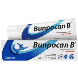 Показания к применениюНевралгии;артралгии;миозиты.Применение при беременности и кормлении грудьюПрепарат противопоказан к применению при беременности и в период лактации (грудного вскармливания).ПротивопоказанияПовышенная чувствительность кожи к компонентам мази;повреждения кожных покровов;туберкулез легких;нарушения мозгового и коронарного кровообращения;склонность к ангиоспазмам;тяжелые нарушения функции печени и почек;беременность;период грудного вскармливания.Побочное действиеПри повышенной чувствительности кожи к компонентам мази могут возникнуть зуд, отек или уртикария.Во избежание побочных явлений рекомендуется предварительно нанести небольшое количество мази на кожу для определения чувствительности.СоставДействующее вещество: Камфора + Салициловая кислота + Скипидар живичный + Яд гадюки (Camphora + Acidum salicylicum + Oleum Terebinthinae + Venenum Viperae beri)Концентрация действующего вещества: 5000 мгВзаимодействие с другими препаратамиДанные о лекарственном взаимодействии препарата Випросал B не предоставлены.