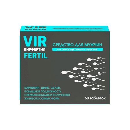 Фармакологическое действие Вирфертил — биологически активная добавка, предназначенная для зачатия при планировании отцовства. До 50% случаев мужского бесплодия связано с неспособностью мужского организма вырабатывать здоровую сперму. Причину бесплодия связывают как с нарушением антиокислительной активности спермы, вызванным недостатком аминокислот, витаминов, микронутриентов, коэнзимов и ряда других биологически активных компонентов, так и с внешними вредными воздействиями (интоксикациями, перегреванием, плохими экологическими условиями и т.п.). Компоненты, входящие в состав биологически активной добавки Вирфертил, предназначены для планирования зачатия и для повышения подвижности сперматозоидов и количества жизнеспособных форм. L-аргинин влияет на здоровье предстательной железы, улучшает процесс образования сперматозоидов и их качество, способствует нормализации эрекции. В мужской половой системе L-карнитин обеспечивает энергией весь процесс созревания сперматозоидов и напрямую влияет на способность мужчины к зачатию ребенка. L-карнитин способен подавлять оксидативный стресс, который имеет важное значение в развитии бесплодия. L-карнитин, коэнзим Q10 и фолиевая кислота улучшают подвижность и увеличивают выработку сперматозоидов. Селен – жизненно необходимый микроэлемент, участвующий во всем жизненном цикле – от зачатия до старения и входит в состав ряда гормонов и ферментов, связанных практически со всеми органами и системами организма человека. Селен защищает клетки от разрушающего действия свободных радикалов. Также селен необходим для нормального функционирования половой системы мужчин. Витамин E уменьшает окислительный стресс в ткани яичек, повышает подвижность и концентрацию сперматозоидов. Совместный прием селена и витамина Е обеспечивает выраженную эффективность в более низких дозах, чем при употреблении их по отдельности. Цинк необходим для клеточного дыхания и воспроизведения генетического материала (ДНК и РНК). Наиболее важный микроэлемент для продукции мужского полового гормона – тестостерона. Цинк активизирует сперматогенез. Дефицит цинка объясняет развитие бесплодия, замедление процессов полового созревания и снижение сексуальных способностей.