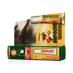Внешний вид: однородная белая или кремовая масса без посторонних примесей.Комплекс компонентов в составе крема ВИРОСЕПТ помогает ускорить заживление высыпаний при герпесе (подсушивание высыпаний, отшелушивание корок). Нанесение крема на наружные части носовых ходов помогает заживлению микротрещин, предотвращая попадание вирусов (грипп, риновирусные, аденовирусные инфекции). Компоненты крема проявляли противовирусную активность в отношении вирусов гриппа подтипов А(H1N1), А(H3N2) и А(H5N1).Описание активных компонентов:Йодистый калий, эфиры параоксибензойной кислоты — антисептический эффект широкого спектра.Трава чистотела — противовоспалительное, противовирусное действие.L-лизин — незаменимая аминокислота, ускоряет процесс заживления.Салициловая кислота — кератолитическое действие. Помогает размягчить и удалить слой поврежденного эпидермиса, облегчает доступ активных компонентов.Окись цинка «подсушивающее» действие.Облепиховое масло, витамин Е, метилпиримидин помогают восстановлению кожи.Облепиховое масло, витамин Е, метил пиримидин помогают ускорить заживление трещин и шелушения на губах и коже вокруг носовых ходов. Наносится перед посещением общественных мест с большим скоплением людей.Рекомендуется применять на всех стадиях развития высыпаний.Результат: Красивые губы, здоровые слизистые носа, защита от факторов внешней среды.