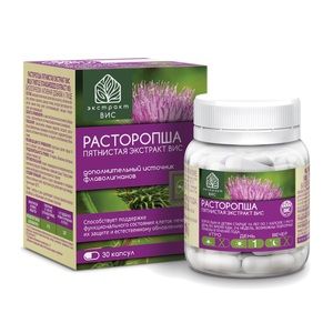 Биологически активные вещества экстракта расторопши флавонолигнаны (силимарин) способствуют поддержке функционального состояния клеток печени, их защите и естественному обновлению. Экстракт ВИC — российские растительные биодобавки для поддержки здоровья. При производстве Экстракт ВИС используются стандартизированные экстракты растений, что обеспечивает высокую точность дозирования и контролируемый уровень содержания активных веществ в 1 капсуле.Состав РАСТОРОПША ПЯТНИСТАЯ ЭКСТРАКТ ВИС (в одной капсуле):Расторопша экстракт (стандартизованный по флаволигнанам/силимарину) — 84,5 мгБиологически активные вещества:67,6 мг силимарин (флаволигнаны) (225 % от адекватного уровня потребления, не превышает верхний допустимый уровень потребления)Расторопша пятнистая (лат. Sílybum mariánum) Расторопша пятнистая , известная как расторопша, уже более 2000 лет используется в народной медицине, как поддержка при различных заболеваниях печени, почек,желудочно-кишечного тракта, сердечных заболеваний и желчнокаменной болезни.В Европе растение традиционно используют в качестве овоща в салатах, а семена используют в качестве стимулятора лактации для кормящих матерей. Основным компонентом экстракта расторопши является силимарин.Свойства Силимарин и его основной компонент силибинин изучают для использования при лечении ожогов, остеопороза, диабета, холестаза и гиперхолестеринемии. Благодаря своему апоптотическому эффекту, без цитотоксических эффектов, силимарин исследуют при лечении различных видов опухолей. Благодаря своему сильному антиоксидантному потенциалу он обладает фетопротекторным (против влияния алкоголя) и пролактиновым действием. Косметическая промышленность изучает антиоксидантные и УФ-защитные эффекты силимарина.