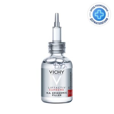 В результате длительных исследований в поиске альтернативы косметологическим процедурам, Эксперты лабораторий Виши разработали Инновацию* — Гиалуроновую сыворотку-филлер пролонгированного действия Liftactiv Supreme с рекордной концентрацией* чистой Гиалуроновой кислоты [1,5%] для ежедневного восполнения Гиалуроновой кислоты в эпидермисе. Это первый шаг в борьбе с возрастными изменениями для эффективного и целенаправленного омолаживающего действия. 1. Сокращает морщины. 2. Восстанавливает потерю объема кожи. 3. Увлажняет кожу. 4. Повышает эластичность кожи. Сыворотка имеет легкую невесомую текстуру для оптимального проникновения в эпидермис и отлично подходит как база под макияж. Продукт протестирован под контролем дерматологов и офтальмологов, подходит для области вокруг глаз. Гиалуроновая кислота ключевой компонент нашей кожи, отвечающая за поддержание эластичности кожи, увлажнение и молодость. С возрастом и под влиянием негативных внешних факторов (УФ лучи, загрязненный воздух, стресс и другие) включаются необратимые механизмы потери Гиалуроновой кислоты в эпидермисе и образуется ее дефицит, что приводит к появлению морщин, сухости и потере объема кожи. Поэтому очень важно компенсировать потерю Гиалуроновой кислоты. В результате длительных исследований в поиске альтернативы косметологическим процедурам, Эксперты лабораторий Виши разработали Инновацию — Гиалуроновую сыворотку-филлер пролонгированного действия Liftactiv Supreme как первый шаг в борьбе с возрастными изменениями для эффективного и целенаправленного омолаживающего действия. Продукт протестирован под контролем дерматологов и офтальмологов, подходит для области вокруг глаз.