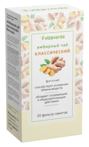 Vita Verde Имбирный чай классический в фильтр-пакетах, представляет собой натуральный продукт, который может стать отличным дополнением к здоровому образу жизни.Основной ингредиент этого фиточая — корень имбиря, содержащий особое вещество гингерол. Оно способствует ускорению метаболизма, помогает эффективно снижать вес и улучшает липидный обмен. Кроме того, имбирь способствует выведению из организма шлаков, продуктов распада и замедляет процессы старения.Полезные свойства имбирного чая:Ускорение метаболизма — гингерол помогает ускорить обмен веществ, что может способствовать более эффективному сжиганию калорий.Поддержка здоровья — имбирь содержит витамины А и С, витамины группы В, органические кислоты, макро- и микроэлементы, а также эфирные масла. Эти компоненты в комплексе оказывают положительное воздействие на организм и восполняют недостаток витаминно-минеральных веществ.Улучшение пищеварения — имбирь известен своими свойствами улучшать пищеварение и облегчать симптомы, связанные с пищеварительной системой, такие как тошнота и вздутие живота.Поддержка иммунной системы — благодаря высокому содержанию витаминов и антиоксидантов, имбирный чай может помочь укрепить иммунную систему и защитить организм от инфекций.Важно помнить, что, несмотря на все полезные свойства, имбирный чай не является лекарственным средством и не может заменить профессиональную медицинскую помощь. Перед началом употребления рекомендуется ознакомиться с противопоказаниями и проконсультироваться с врачом.