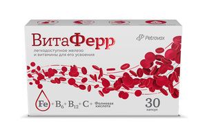 Витаферр — препарат, который объединяет в себе легко усваиваемое железо и витамин С, необходимые для его лучшего усвоения в организме. Препарат представлен в форме капсул, в одной упаковке — 30 штук. Витаферр рекомендуется для использования при железодефицитной анемии и других заболеваниях, связанных с дефицитом железа в организме.