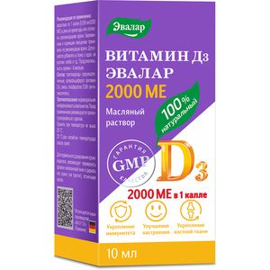 Витамин Д3 2000 МЕ капли. Масляный раствор натурального витамина D3. 2000 МЕ в 1 каплеАктивное вещество: Холекальциферол (витамин D3)Действие: для укрепления иммунитета, лучшего усвоения кальция, повышения силы мышц, поддержания сердечно-сосудистой и нервной систем.За последние несколько лет во всем мире выросла популярность витамина D3. По данным ВОЗ 80% россиян испытывает дефицит витамина D3. Он очень важен для нашего здоровья, так как повышает иммунитет, снижает уровень воспаления и вирусной активности, а также участвует еще в двухстах функциях организма.Витамин Д3 2000 МЕ капли от «Эвалар» – это дополнительный источник витамина D3. Натуральный витамин D способствует: ускоренному восполнению его дефицита в организме, лучшему усвоению кальция, укреплению костей, зубов, снижению риска развития остеопороза, повышению силы мышц, активации иммунитета на клеточном уровне и снижению риска развития простудных заболеваний, участвует в поддержании сердечно-сосудистой, нервной систем и репродуктивной функции организма, в повышении уровня серотонина – «гормона счастья» и улучшении настроения.Преимущества масляного раствора витамина D3: Натуральный витамин D3 на кокосовом масле –легкоусваиваемый и гипоаллергенный Удобное дозирование 2000 МЕ в 1 капле Нейтральный вкус и запах Не содержит аллергенных компонентов и спирта Экономный расход препарата Сырье высокого качества (BASF SE — Германия)Как работает витамин D3?Прием витамина D3 способствует снижению заболеваемости ОРВИ, в том числе новой коронавирусной инфекции COVID-192. Доказано, что в странах, где у пациентов с COVID-19 более высокое содержание в организме витамина D3 риск осложнений значительно ниже3. Витамин D3 повышает защитные силы организма, снижает уровень «цитокинового шторма» (гипервоспаления), поддерживает функцию легких.