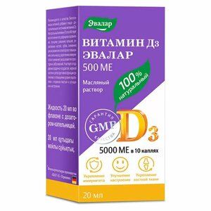 За последние несколько лет во всем мире выросла популярность витамина D3. По данным ВОЗ 80% россиян испытывает дефицит витамина D31. Он очень важен для нашего здоровья, так как повышает иммунитет, снижает уровень воспаления и вирусной активности, а также участвует еще в двухстах функциях организма.Прием витамина D3 способствует снижению заболеваемости ОРВИ, в том числе новой коронавирусной инфекции COVID-192. Доказано, что в странах, где у пациентов с COVID-19 более высокое содержание в организме витамина D3 риск осложнений значительно ниже3. Витамин D3 повышает защитные силы организма, снижает уровень «цитокинового шторма» (гипервоспаления), поддерживает функцию легких.Влияние витамина D3 на иммунную систему4• Прием витамина D3 снижает риск развития ОРЗ в среднем на 12%,• Витамин D3 лучше принимать ежедневно, а не однократно (риск развития ОРЗ снижается на 19%),• Защитный эффект более выражен у людей с исходно низким уровнем витамина D3 в крови (риск снижается на 70%),• Витамин D3 положительно влияет на работу легких, способствуя улучшению дыхательной функции,• У больных с пневмонией, а также на искусственной вентиляции легких, чаще встречается недостаточность витамина D3.Витамин D3 500 МЕ от «Эвалар» – это самая популярная5 форма витамина D3.Витамин D3 500 МЕ Эвалар способствует:Укреплению иммунитета и снижению риска развития простудных заболеванийВосполнению дефицита витамина D в организмеЛучшему усвоению кальцияУкреплению костей, зубов, снижению риска развития остеопорозаПовышению силы мышцПоддержанию сердечно-сосудистой, нервной систем и репродуктивной функции организмаПовышению уровня серотонина «гормона счастья»Преимущества масляного раствора витамина D3:Натуральный витамин D3на кокосовом масле –легкоусваиваемый и гипоаллергенныйСамый доступный по цене7Удобное дозирование 5000 МЕ в 10 капляхНейтральный вкус и запах, хорошо воспринимается как детьми6,так и взрослымиНе содержит аллергенных компонентов и спиртаЭкономный расход препарата (360 доз в 1 флаконе 10 мл.)Сырье высокого качества (BASF SE — Германия)