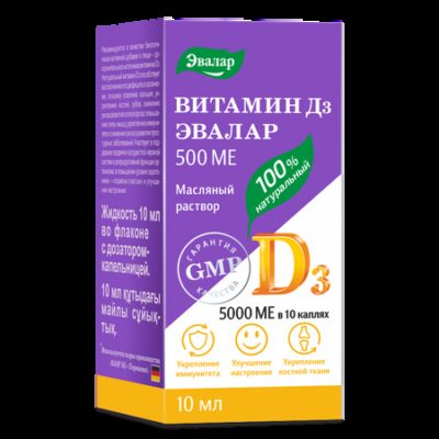 Витамин D3 500МЕ Эвалар способствует: Восполнению дефицита витамина D в организме Лучшему усвоению кальция Укреплению костей, зубов, снижению риска развития остеопороза Повышению силы мышц Укреплению иммунитета и снижению риска развития простудных заболеваний Поддержанию сердечно-сосудистой, нервной систем и репродуктивной функции организма Повышению уровня серотонина «гормона счастья»Преимущества масляного раствора витамина D3: Физиологичная для организма жирорастворимая форма витамина D3 Удобное дозирование (флакон с дозатором-капельницей) Экономный расход препарата (20 000 МЕ в 1 мл) Высокое усвоение за счет масляной формы Нейтральный вкус и запах Не содержит аллергенных компонентов и спирта Сырье высокого качества