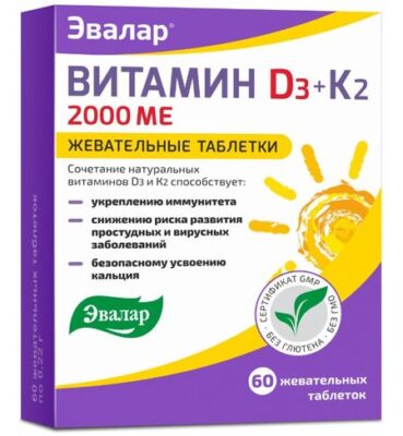 Главная » Аптека ВИТАМИН Д3+К2 ЭВАЛАР табл. жеват. 2000 МЕ №60 Просмотров 7 ВИТАМИН Д3+К2 ЭВАЛАР табл. жеват. 2000 МЕ №60 по цене от 493 р. в аптеках МАКСАВИТ Эвалар