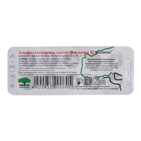 Показания При приеме внутрь абсорбция составляет 50-80%; в процессе всасывания образует комплекс с липопротеидами (внутриклеточные переносчики токоферола). Для абсорбции необходимо наличие желчных кислот. Связывается с альфа1- и бета-липопротеидами, частично — с сывороточным альбумином. При нарушении обмена белков транспорт затрудняется. Cmax достигается через 4 ч. Метаболизируется в печени до производных, имеющих хиноновую структуру (некоторые из них обладают витаминной активностью). Выделяется с грудным молоком. У недоношенных и новорожденных детей возможна его кумуляция. Депонируется в надпочечниках, гипофизе, семенниках, жировой и мышечной ткани, эритроцитах, печени. Более 90% выводится с желчью, 6% — почками. Фармакологическое действие Витамин E. Оказывает антиоксидантное действие, участвует в биосинтезе гема и белков, пролиферации клеток, тканевом дыхании, других важнейших процессах тканевого метаболизма, предупреждает гемолиз эритроцитов, препятствует повышенной проницаемости и ломкости капилляров; стимулирует синтез белков и коллагена. Лекарственное взаимодействие При одновременном применении витамин Е усиливает эффект ГКС, НПВС, сердечных гликозидов. Одновременное применение витамина Е в дозе более 400 мг/сут с антикоагулянтами (производными кумарина и индандиона) повышает риск развития гипопротромбинемии и кровотечений. При одновременном применении колестирамин, колестипол, минеральные масла снижают всасывание альфа-токоферола ацетата. При одновременном применении витамина Е с циклоспорином повышается абсорбция последнего.