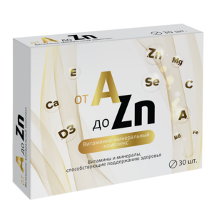 ВИТАМИННЫЙ КОМПЛЕКС A-ZN — вся сила и польза витаминов и минералов для Вашего здоровья!Суточная доза (2 таблетки) содержит:Витамин А (РЭ) 2,32 мг (±20%)Витамин С 100 мг (±15%)Витамин D3 5 мкг (200 МЕ) (±20%)Витамин Е (ТЭ) 15,4 мг (±20%)Витамин В1 2 мг (±20%)Витамин В2 3 мг (±20%)Витамин В3 (РР) 15 мг (±20%)Витамин В6 4 мг (±20%)Витамин В12 6 мкг (±20?%)Биотин (Витамин В7) 100 мкг (±20%)Пантотеновая кислота (Витамин В5) 9,2 мг (±20%)Фолиевая кислота (Витамин В9) 400 мкг (±20%)Кальций 176 мг (±15%)Фосфор 130 мг (±20%)Магний 60 мг (±20%)Цинк 20 мг (±20%)Селен 70 мкг (±20%)Железо 10 мг (±20%)Марганец 2 мг (±20%)Медь 1 мг (±20%)Хром 44 мкг (±20%)Йод 152 мкг (±20%)Рутин 50 мг (±20%)Роль витаминов в организме человека многообразна и сложна. При их недостатке могут развиваться различные нарушения в работе организма.Активные ингредиенты:Витамин А — эффективный антиоксидант, помогает ускорить белковый обмен в хрящевой и костной ткани. Способствует обеспечению хорошего зрения в условиях недостаточного или слабого освещения (сумеречное зрение).Витамин С повышает сопротивляемость организма различным инфекциям, способствует повышению эластичности кровеносных сосудов.Витамин D3 способствует поддержанию иммунитета, важен для нормального усвоения кальция в кишечнике и обеспечения прочности зубов и костей. Участвует в синтезе серотонина — «гормона счастья», который отвечает за хорошее настроение.Витамин Е благотворно влияет на состояние кожи, повышая ее способность к регенерации и помогая ей лучше удерживать влагу и сохранять упругость. Способствует укреплению стенок кровеносных сосудов, участвует в синтезе многих гормонов.Витамины группы В способствуют правильной работе нервной системы. Благоприятно влияют на иммунитет, состояние сердца и сосудов.Кальций — основной строительный материал костей (99% кальция содержится в костях), зубов, является важным компонентом волос и ногтей.Магний способствует уменьшению раздражительности, тревоги, снятию спазмов мышц и сосудов, обеспечению стабильной работы сердца.Цинк принимает участие в углеводном обмене, необходим для выработки и хранения инсулина клетками поджелудочной железы. Является антиоксидантом, способствует повышению устойчивости клеток кожи к повреждению свободными радикалами. Помогает организму противостоять простудным заболеваниям.Селен повышает сопротивляемость организма вирусам и бактериям. Благоприятно влияет на обменные процессы, способствует нормализации деятельности нервной и эндокринной систем.Железо участвует в обеспечении кислородом всех органов и тканей, так как является составной частью гемоглобина.Марганец участвует в жировом и углеводном обмене, в образовании костной и соединительной ткани. Способствует защите стенок артерий, делая их более устойчивыми к образованию атеросклеротических бляшек. Обладает выраженной антиоксидантной активностью.Медь принимает активное участие в построении многих белков и ферментов. Помогает улучшить усвоение белков и углеводов. Входит в состав миелиновых оболочек нервов.Хром участвует в регуляции работы сердечной мышцы и кровеносных сосудов, благоприятно влияет на выведение из организма солей тяжелых металлов, токсинов. Вместе с инсулином действует как регулятор уровня сахара в крови. Хром позволяет легче придерживаться низкоуглеводного питания за счет уменьшения тяги к сладкому, а также помогает ускор