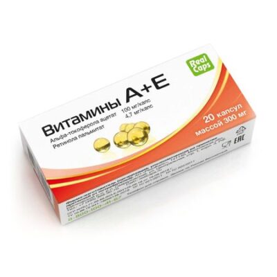 Витамины А+Е N20 КАПС /РЕАЛКАПС/ (Биологически активная добавка (БАД) к пище) — капсулы мягкие желатиновые, сферической формы, прозрачные, от светло-желтого до темно-желтого цвета.Действие БАДа определяется свойствами входящих в его состав жирорастворимых витаминов А и Е.Ретинола пальмитат (витамин А) — жирорастворимый витамин, играет важную роль в окислительно-восстановительных процессах, участвует в синтезе сложных углеводов, белков и жиров. Он необходим для нормальной репродуктивной функции, эмбрионального развития, обновления клеток кожи и слизистых оболочек и образования костной ткани. Участвует в механизме зрения. Ретинол повышает иммунитет, ослабляет последствия ряда инфекционных заболеваний, может препятствовать развитию злокачественных новообразований.Альфа-токоферола ацетат (витамин Е) препятствует разрушению клеточных оболочек, участвует в синтезе белков, процессах деления клеток, тканевом дыхании, благоприятно влияет на нарушенный жировой обмен. Витамин Е поддерживает стабильность красных кровяных телец и предупреждает их распад, препятствует повышенной проницаемости и ломкости капилляров, повышает устойчивость тканей к недостатку кислород. Витамин Е также способствует восстановлению скелетных мышц при мышечной дистрофии и других поражениях мышц. При сердечно-сосудистых заболеваниях в комплексной терапии витамин Е способствует нормализации обмена веществ в сердечной мышце, повышает скорость кровотока и поддерживает напряжение в мелких сосудах. Витамин Е также способствует нормализации функции половых желез у мужчин.