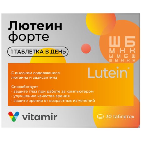 Фармакологическое действие Лютеин Форте® является источником каротиноидов, флавоноидов, витаминов и минеральных веществ, необходимых для поддержания функционального состояния зрительного аппарата. Сетчатка, особенно ее центральная часть (макула), имеет естественную защиту – пигментный слой, содержащий каротиноиды, лютеин и зеаксантин. Лютеин не синтезируется в организме человека и поступает в организм только с пищей (фруктами и овощами), а зеаксантин образуется в сетчатке из лютеина. От уровня содержания лютеина и зеаксантина в сетчатке зависит ее здоровье. Чтобы сохранить хорошее зрение, человек ежедневно должен получать с пищей 5 мг лютеина и 1 мг зеаксантина – такое количество содержится в 250 г шпината, 0.5 кг сладкого перца или 1 кг моркови. Обычный рацион содержит менее 20% нормы. Лютеин и зеаксантин Накапливаясь в макуле (центральной области сетчатки) и хрусталике, выполняют функции светофильтра и защищают важные структуры глаза от наиболее агрессивной (синей) части спектра дневного света. Лютеин и зеаксантин являются мощными антиоксидантами первого порядка, способны нейтрализовать действие свободных радикалов и предупреждать разрушение сетчатки и помутнение хрусталика. Таурин Аминокислота, участвующая в передаче фотосигналов, стимулирует регенерацию и метаболизм тканей глаза. Способствует нормализации функции клеточных мембран и активации энергетических обменных процессов светочувствительных клеток. Витамин А Участвует в обмене зрительного пигмента родопсина. Распад этого комплекса под влиянием света играет существенную роль в механизме возникновения зрительного ощущения (фотосигнала). Восстановление родопсина и увеличение его содержания в сетчатке обеспечивает адаптацию глаза к пониженной освещенности (темновая адаптация). Витамин С Обладает способностью к быстрым и обратимым окислительно-восстановительным превращениям, регулирует восстановление зрительных пигментов, уменьшает повышенное внутриглазное давление, снижает риск развития глаукомы и обладает значительной антиоксидантной активностью. Витамин Е Ускоряет регенерацию поврежденных клеток, участвует в тканевом дыхании и других важнейших процессах тканевого метаболизма. Препятствует повышенной ломкости и проницаемости капилляров. Селен, медь, хром, цинк Комплекс жизненно важных микроэлементов, является постоянной составной частью тканей глаза и обеспечивает нормальный метаболизм и восстановление клеточных структур. Клинические исследования биологически активной добавки Лютеин Форте® проведены на кафедре офтальмологии Военной Медицинской Академии им. Кирова (г.Санкт-Петербург).