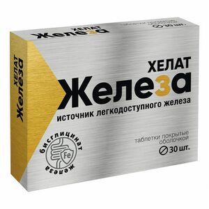 Железа бисглицинатЖелезо участвует во множестве биологических процессов в организме человека, в первую очередь обеспечивая доставку кислорода тканям и органам. Недостаток этого микроэлемента очень часто встречается у людей во всем мире. Это может быть следствием скудного рациона или плохой усвояемости железа.Биологически активная добавка к пище «Железа бисглицинат» содержит железо в органической форме, которое легко усваивается организмом и способствует поддержке его жизнедеятельности.Информация о биологически активных веществах и их свойствах:Железо является микроэлементом, поступление которого необходимо для нормальной жизнедеятельности организма. Биологическая роль этого эле- мента очень многогранна. Она включает участие в окислительно-восстановительных реакциях, кроветворении, снабжении органов и тканей кислородом, активации и ингибировании (подавлении активности) целого ряда ферментов. Кроме того, различные метаболические процессы в организме также протекают с участием железа: обмен холестерина, разрушение перекисных соединений, многочисленные превращения витаминов.Железа бисглицинат органическая форма микроэлемента, которая благодаря своему химическому строению усваивается нашим организмом лучше по сравнению с минеральными солями железа.