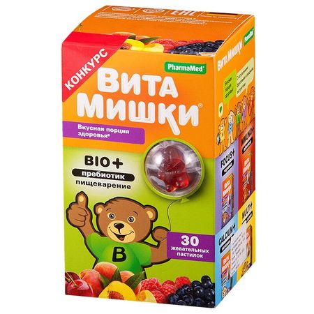 Линия биокомплексов ВитаМишки® — вкусные детские витамины №1 в России — жевательные мармеладные мишки на основе натуральных соков.ВитаМишки® Bio+ пребиотик — сбалансированный витаминно-растительный комплекс с пребиотиками в виде вкусных мармеладных пастилок-мишек с натуральными фруктовыми и овощными экстрактами для детей с 3-х лет.• Входящие в состав комплекса инулин, фруктоолигосахариды и экстракт плодов фенхеля способствуют восстановлению полезной микрофлоры кишечника, улучшают пищеварение и нормализуют аппетит.• Способствует регулярному освобождению кишечника.• Обогащает детский организм витаминами группы В.Содержание в 1 пастилкеВитамины:Витамин В1 0,2 мгВитамин В3 3,0 мгВитамин В6 0,3 мгБиотин 5 мкгХолин 20 мгИнулин 652 мгФруктоолигосахариды 50 мгЭкстракт плодов фенхеля 10 мгПищевая ценность 1 пастилки: углеводы — 2 г, энергетическая ценность — 8 ккал / 33 кДж.Произведено в Германии.Не содержит искусственных красителей и вкусовых добавок.