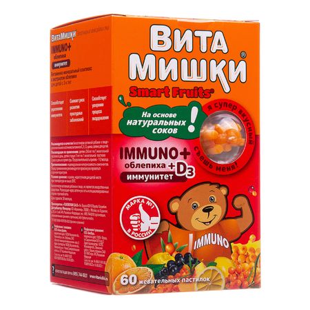 Линия биокомплексов ВитаМишки® — вкусные детские витамины №1 в России — жевательные мармеладные мишки на основе натуральных соков.ВитаМишки® Immuno + облепиха — сбалансированный витаминно-минеральный комплекс в виде вкусных мармеладных пастилок-мишек с натуральными фруктовыми и овощными экстрактами для детей с 3-х лет.• Снижает риск развития простудных заболеваний.• Способствует укреплению иммунитета.• Способствует ускорению процесса выздоровления.Жевательные пастилки с апельсиновым, персиковым, виноградным и лимонным вкусом.Содержание в 1 пастилкеВитамины:Витамин C 45 мгВитамин Е 6 МЕМинеральные вещества:Цинк 5 мгСелен 15 мкгЭкстракт плодов и листьев облепихи 60 мгПроизведено в Германии.Не содержит искусственных красителей и вкусовых добавок.