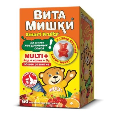 ВИТАМИШКИ® Кид’с формула PharmaMed (Канада) пастилки жевательные; флакон (флакончик) 60, коробка (коробочка) 1; код EAN: 027917006086; № 77.99.23.3.У.11418.12.09, 2009-12-15 от Фармамед АО (Россия); производитель: Supplement Sciences Inc. (США) Латинское название Vitamishki Kid’s formula®Фармакологические группыБАДы — жиры, жироподобные вещества и их производныеБАДы — витаминно-минеральные комплексы Нозологическая классификация (МКБ-10) E61.8 Недостаточность других уточненных элементов питанияE83 Нарушения минерального обменаZ29.1 Профилактическая иммунотерапияХарактеристика Биологически активная добавка к пище. Фармакологическое действие Фармакологическое действие — нормализующее обменные процессы, восполняющее дефицит витаминов и микроэлементов, иммуномодулирующее.Свойства компонентов Комплекс оказывает антиоксидантное, иммуностимулирующее, общеукрепляющее действие, которое обусловлено эффектами входящих в его состав витаминов и минералов. Витамины А, С, Е — антиоксиданты, повышают неспецифическую иммунорезистентность организма к инфекциям и неблагоприятным экологическим факторам. Витамин D — регулирует обмен кальция и фосфора в организме, оказывает антирахитическое действие. Рибофлавин — является катализатором процессов клеточного дыхания. Витамин В6 (пиридоксин) — в качестве кофермента принимает участие в белковом обмене. Витамин В12 — является фактором кроветворения, необходим для синтеза миелина и нуклеиновых кислот. Пантотеновая кислота — улучшает энергетическое обеспечение сердечной мышцы. Кальций — укрепляет зубы и костную ткань, способствует росту и правильному формированию скелета. Магний — повышая синтез дофамина, снимает беспокойство, раздражительность, плаксивость. Цинк — иммуномодулятор, входит в состав многих ферментов. Йод — необходим для синтеза гормонов щитовидной железы. Инозитол и холин — улучшают жировой обмен. Рекомендуется для профилактики и лечения гиповитаминозов и дефицита минеральных веществ;Противопоказания при снижении иммунитета; при предрасположенности к простудным заболеваниям; для профилактики респираторных инфекций в период эпидемий. для поддержки организма при учебных нагрузках. Индивидуальная непереносимость компонентов. Побочные действия Не выявлены.Условия хранения ВИТАМИШКИ® Кид’с формулаВ сухом месте, при комнатной температуре, вдали от источников тепла. Хранить в недоступном для детей месте. Срок годности ВИТАМИШКИ® Кид’с формула 3 года. 2000-2015. Регистр лекарственных средств РоссииБаза данных предназначена для специалистов сферы здравоохранения.Не разрешается коммерческое использование материалов. Не применять по истечении срока годности, указанного на упаковке.