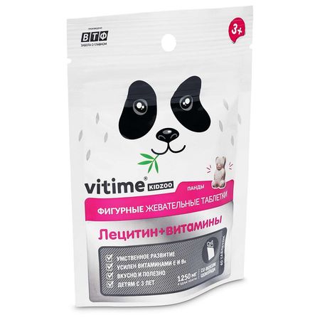VITIME KIDZOO ЛЕЦИТИН /ШОКОЛАД — Комплекс лецитина, фосфора и витаминов Е и В6 для нормализации работы головного мозга и помощи печени. Возраст: с 3-х лет Основной источник лецитина — животная пища: жирное мясо, яичный желток, икра рыб. Многие дети отказываются есть мясо или едят его в недостаточном количестве, что препятствует получению суточной дозы лецитина. Лецитин можно получить дополнительно, например, принимая VITime® KidZoo Лецитин + витамины. В его составе: • лецитин, который улучшает работу нервных клеток; • витамин В6, способствующий тренировке памяти, а также улучшению настроения; • витамин Е, усиливающий мозговую активность, снижающий нагрузку на нервную систему; • фосфор, необходимый для выработки и использования энергии. Преимущества комплекса • Не содержит консервантов, искусственных красителей и ароматизаторов, ГМО. • Единственный комплекс с лецитином для детей в форме жевательных таблеток *. • Вкусные таблетки в форме мишек легко разжевываются и нравятся детям. • Со вкусом шоколада. * на территории РФ. Содержание активных компонентов в 1 жевательной таблетке • Фосфор — 100 мг. • Фосфолипиды (лецитин) — 145 мг. • Витамин Е — 5 мг. • Витамин В6 — 1 мг. Компоненты комплекса способствуют: • улучшению работы головного мозга; • укреплению памяти и повышению концентрации внимания; • защите печени. Пищевая ценность 1 таблетки: углеводы — 0,52 г. Энергетическая ценность 1 таблетки — 9 кДж/2 ккал.