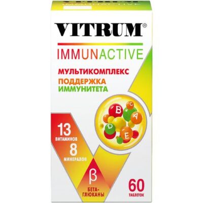 Витамины (от лат. Vita — жизнь) — низкомолекулярные органические соединения различной химической природы, необходимые для осуществления жизненно важных биохимических и физиологических процессов в живых организмах. Организм человека и животных не синтезирует витамины или синтезирует в недостаточном количестве, поэтому он должен получать их в готовом виде с пищей. Кроме витаминов, в рационе человека в малых дозах должны присутствовать другие незаменимые вещества — макро- и микроэлементы. Они участвуют во многих жизненно важных обменных реакциях, некоторые из них необходимы для обеспечения должного уровня активности соответствующих витаминов. Недостаточное потребление белка, витаминов и минеральных веществ приводит к снижению устойчивости и адаптации организма к воздействию физических, химических и биологических факторов окружающей среды, в том числе к бактериям и вирусам. Микроэлементы и витамины способствуют поддержанию естественной иммунной защиты, охраняя физические барьеры (кожа/слизистая), поддерживая тем самым системы клеточного иммунитета, а также производство антител. Витаминно-минеральный комплекс ВИТРУМ ИММУНАКТИВ VITRUM IMMUNACTIVE содержит 13 витаминов и 8 минералов, а также бета-глюканы и биофлаваноидный комплекс — необходимые компоненты, которые синергично работают для поддержки иммунитета: — Витамины А, С, Е способствуют улучшению барьерной функции слизистых оболочек, способствуют продукции иммуноглобулина А, интерферона, в слизистых оболочках дыхательного тракта, участвуют в антиоксидантной защите организма, что приводит к уменьшению прикрепления и дальнейшего проникновения бактерий и вирусов. — Витамины В6, В12, С, D, Е и фолиевая кислота наряду с микроэлементами (железо, цинк, медь и селен) действуют синергично в поддержке функционирования иммунных клеток. Недостаточное потребление этих витаминов и микроэлементов может приводить к подавлению иммунитета — Селен и цинк — природные элементы антиоксидантной системы защиты организма человека. Цинк участвует в дифференциации лимфоцитов, особенно Т-звена, ускоряя появление иммунного ответа на инфекцию в организме. Среди иммуномодулирующих эффектов цинка, которые имеют прямое отношение к защите от вирусной инфекции, является стимуляция производства интерферона-альфа и интерферона-гамма. Селен регулирует производство иммуноглобулина G, повышает активность лимфоцитов. — Бета-глюканы, природные вещества (полисахариды), которые содержатся в водорослях, злаковых, растениях, грибах, бактериях, дрожжах. Бета-глюканы активизируют клетки иммунной системы, способствуют защите от влияния патогенных микроорганизмов. — Биофлавоноиды (их собирательно называют витамином Р) — растительные соединения, которые содержатся в плодах, цветах и стеблях различных растений, особенно цитрусовых и розоцветных. Биофлавоноиды — сильные природные антиоксиданты, они способствуют лучшему усвоению витамина C, улучшают состояние сосудистой системы, укрепляют стенки капилляров. Активный компонент Содержание в суточной норме потребления (1 таблетка, покрытая оболочкой, массой 1400 мг) % от рекомендуемого уровня суточного потребления или адекватного* уровня потребления Витамин А 0,8 мг 100 Витамин С 80 мг 133** Витамин B1 1,1 мг 79 Витамин B2 1,4 мг 88 Витамин B3 (PP) 16 мг 89 Витамин В5 6 мг 100 Вит