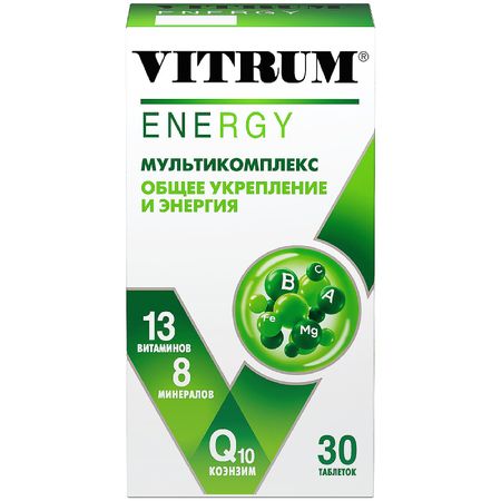 Витамины (от лат. Vita – жизнь) – низкомолекулярные органические соединения различной химической природы, необходимые для осуществления жизненно важных биохимических и физиологических процессов в живых организмах. Организм человека и животных не синтезирует витамины или синтезирует в недостаточном количестве, поэтому он должен получать их в готовом виде с пищей. Кроме витаминов, в рационе человека в малых дозах должны присутствовать другие незаменимые вещества – макро- и микроэлементы. Они участвуют во многих жизненно важных обменных реакциях, некоторые из них необходимы для обеспечения должного уровня активности соответствующих витаминов. Усталость, упадок сил, слабость, нервное перенапряжение − часто это следствие неудовлетворения текущих потребностей организма в энергии. Вредное воздействие окружающей среды, недостаток полезных компонентов в пище, интенсивный уровень жизни, постоянные стрессы способствуют дефициту необходимых организму витаминов, а также минеральных элементов. Прием оральных контрацептивов так же нарушает статус многих микроэлементов в организме: фолиевой кислоты, витаминов группы В, витамина С, цинка, магния. Недостаток микроэлементов в питании может нарушить способность к запоминанию и мыслительной деятельности, способствовать развитию депрессии. Дефицит витаминов группы В (особенно тиамина В1, ниацина В3, фолиевой кислоты и витамина В12) может нарушить ментальные функции, ухудшить память, снизить концентрацию внимания. Витаминно-минеральный комплекс ВИТРУМ ЭНЕРДЖИ VITRUM ENERGY содержит 13 витаминов и 8 минералов, а также коэнзим Q10 − необходимые компоненты, которые работают для поддержания энергии и тонуса:  На работоспособность и энергичность ключевое влияние оказывают витамины группы В: — витамины В1, В2, В3, В5 регулируют функциональное состояние центральной нервной системы, обмен веществ и трофику тканей, поэтому их применяют для повышения общей реактивности организма. — Витамины группы В и железо участвуют в формировании гемоглобина, улучшают циркуляцию крови, осуществляют транспорт питательных веществ, ускоряют процессы регенерации, усиливают сопротивляемость организма к различным стрессовым ситуациям, участвуют в синтезе нейротрансмиттеров. — Магний контролирует баланс внутриклеточного калия, регулирует функции сердечно-сосудистой и нервной систем, участвует в энергетических процессах организма, устраняет судороги в мышцах, помогает снять стресс, способствует восстановлению сил после физических нагрузок. — Витамин С − антиоксидант, участвует в сопротивляемости организма к различным стрессовым ситуациям, способствует синтезу коллагена, поддержанию нормального тонуса, укреплению сосудистой стенки. — Витамин Д ответственен за поддержание функций скелета, регулирует обмен кальция, тонус нервной системы, нормальное соотношение сна и бодрствования, способствует поддержанию нормального тонуса мышц и сердечно-сосудистой системы. — Йод способствует поддержанию физических и умственных функций организма, при его дефиците наблюдается снижение иммунитета. — Коэнзим Q10 (убихинон) является витаминоподобным веществом, которое улучшает выработку энергии в клетках, оказывает благоприятное воздействие на сердечно-сосудистую систему, способствует повышению работоспособно