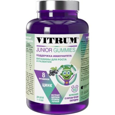 Витаминно-минеральный комплекс Витрум Юниор мармеладки со вкусом черной смородины — для детей 11 — 14 лет. Новые мармеладки от VITRUM — это вкусный и удобный способ заботы о здоровье вашего ребенка каждый день. Содержат сбалансированный набор витаминов и минералов: витамины Д3, С, Е, К, витамины группы В, цинк. Предназначены для укрепления иммунитета ребенка в период вирусных заболеваний и поддержки организма в период повышенных умственных нагрузок.
