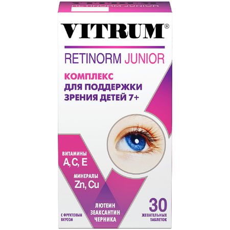 Фармакологическое действие Фармакологическая группа: БАД Описание: Компоненты биологически активной добавки к пище «ВИТРУМ РЕТИНОРМ ЮНИОР» (далее ВИТРУМ РЕТИНОРМ ЮНИОР) не синтезируются в организме человека, поэтому должны поступать извне с пищей или в составе биологически активных добавок. В современный век телевизоров, компьютеров и смартфонов нагрузка на детское зрение значительно возросла, так как большинство используемых ребенком электронных устройств являются источниками сине-фиолетового излучения, повреждающего сетчатку глаза. По мере взросления ребенка, ситуацию усложняют интенсивные зрительные нагрузки во время школьного обучения. Согласно мнению специалистов, снижение зрения, приобретенное в школьном возрасте, встречается наиболее часто. Важную роль в поддержании зрительных функций играет собственная антиоксидантная защита. Недостаточный антиоксидантный статус может быть связан с дефицитом витаминов А, Е, С, растительных каротиноидов (лютеин и зеаксантин) и микроэлементов. Антиоксидантные витаминно-минеральные комплексы с лютеином и зеаксантином способствуют поддержанию зрительных функций. Входящие в состав ВИТРУМ РЕТИНОРМ ЮНИОР компоненты, восполняя дефицит основных питательных веществ в быстрорастущем организме ребенка, способствуют нормализации обменных процессов в тканях глаза и поддержанию функционального состояния зрительного аппарата при повышенных нагрузках. ЛЮТЕИН И ЗЕАКСАНТИН. Зрение напрямую зависит от степени плотности макулы (желтого пятна) – центральной части сетчатки глаза. Растительные каротиноиды (лютеин и зеаксантин), накапливаясь в желтом пятне, защищают его от воздействия агрессивного сине-фиолетового и УФ-излучения. Обладая высокой антиоксидантной активностью, лютеин и зеаксантин блокируют действие свободных радикалов, предохраняя от повреждения ткани глаза и способствуя сохранению зрительных функций. ЭКСТРАКТ ПЛОДОВ ЧЕРНИКИ. Натуральная концентрированная вытяжка из плодов черники, содержащая антоцианы, способствует защите глаза от негативных воздействий, улучшает кровоток в сосудах глаза, ускоряют восстановление обесцвеченного родопсина, необходимого для улучшения адаптации глаз в условиях низкой освещенности или тусклого света. ВИТАМИНЫ А, Е и С. Являются распространенными антиоксидантами, которые усиливают и дополняют действие друг друга, защищая ткани глаза от повреждения. Способствуют восстановлению зрительных пигментов (родопсин и др.) палочек и колбочек, отвечающих за нормальное свето- и цветовосприятие. Способствуют укреплению стенок и повышению эластичности кровеносных сосудов, в том числе сосудов глазного дна. Участвуют в тканевом дыхании и других процессах клеточного обмена. ЦИНК И МЕДЬ. Необходимые микроэлементы для поддержания функции зрения, оказывают антиоксидантное действие, снижая неблагоприятное влияние окружающей среды. Способствуют улучшению питания глаз и поддерживают функциональное состояние органа зрения. Недостаточное потребление данных микроэлементов может привести к ухудшению зрения. Цинк и медь представлены в органической форме цитратов, которые являются более биодоступными формами минералов. Цитраты, являясь хорошими транспортировщиками в клетки кишечника, способствуют оптимальному усвоению микроэлементов о