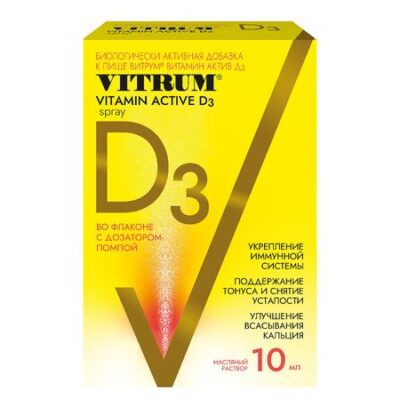 ВИТРУМ ВИТАМИН Д3 АКТИВ /СПРЕЙ — Биологически активная добавка (БАД) к пище-витамин D3 для поддержки иммунной системы-способствует поддержанию нормальной функции мышц-улучшение всасывания кальция-восполнение недостатка витамина D3-витамин D3 поддерживает баланс кальция и фосфора в организмеОдно нажатие на дозирующее устройство — 0,1 мл растворавитамина D3 в 0,1 мл 400 МЕ