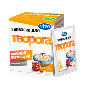 Закваска для творога VIVO предназначена для самостоятельного приготовления настоящего творога, который можно есть даже маленьким детям. Настоящий творог Гарантия свежести и натуральности Содержит кальций и белокЗакваска для приготовления настоящего домашнего творога, вкус которого знаком из детства. Это натуральный, без добавок, стабилизаторов и консервантов источник кальция, фосфора, калия и белка. Творог необходим для формирования клеток, укрепления и роста костной ткани и восстановления мышц.Творог из закваски VIVO прекрасно подходит как прикорм для маленьких детей и натуральное питание для взрослых, в особенности: для спортсменов, кормящих и будущих мам, а также всех, кто придерживается здорового рациона.Натуральный кисломолочный продукт содержит легкоусвояемый полноценный белок — основной строительный материал для клеток. Творог — также источник кальция и фосфора в соотношении 2:1, что способствует укреплению костей и зубов. Особенно, это полезно: детям, растущий организм которых особенно нуждается в кальции женщинам во время беременности людям с высокими физическими нагрузкам людям преклонного возраста.Домашний творог имеет нежный приятный вкус, который любят даже маленькие гурманы. Во время приготовления кисломолочного продукта вы самостоятельно можете регулировать консистенцию, уменьшая или увеличивая количество отжатой сыроватки.
